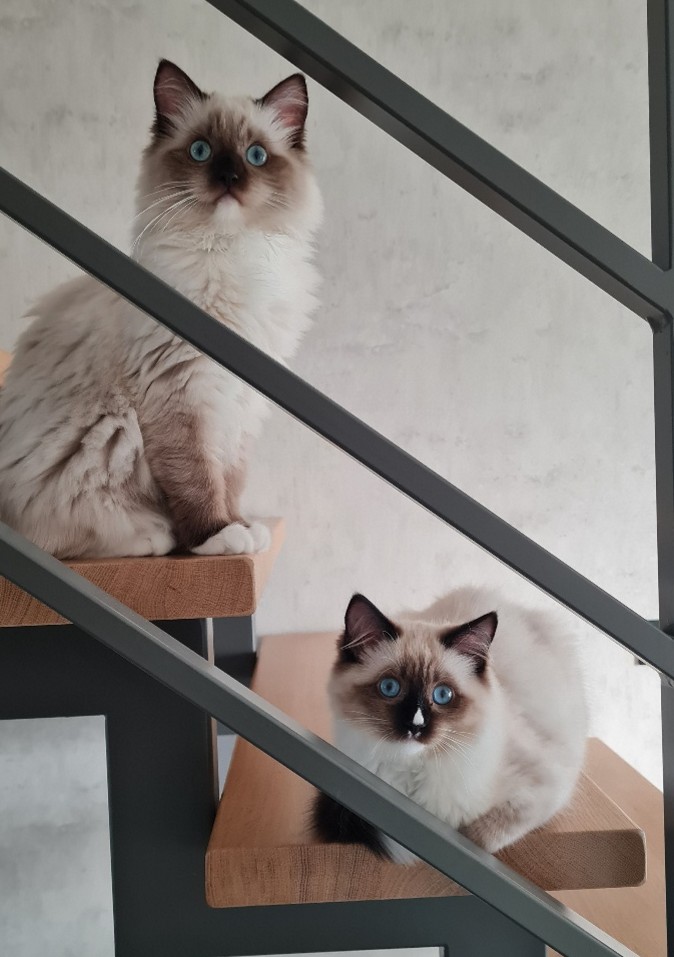 Ende November 2025 sind die beiden Ragdoll-Mädchen aus der Zucht von Familie Feldpausch bei uns eingezogen und haben unser Zuhause vom ersten Moment bereichert. Wir haben die zwei Kätzchen sofort ins Herz geschlossen (und sie uns mittlerweile auch😊), denn sie sind verschmust, verspielt und vom ersten Tag neugierig durch ihr neues Zuhause gestreift. Besonders beeindruckt hat uns, wie zutraulich und entspannt sie bereits am Ankunftstag waren. Heute hören sie auf die Namen Fine (Xena) und Murmel (Yuki): Fine ist die ältere, ruhigere Kuschelmaus, während Murmel als kleine Quasselstrippe gerne mit uns „spricht“. Uns war besonders wichtig, dass sich die Kätzchen, die wir adoptieren, gut verstehen, und obwohl sie nur Halbgeschwister sind, hat uns Frau Feldpausch schnell unsere Sorge genommen. Die Fotos aus der Wurfkiste, auf denen beide friedlich beieinander lagen und Fine liebevoll von Murmels Mama Raika mit großgezogen wurde, sowie Updates zum gemeinsamen Aufwachsen der beiden, haben uns endgültig überzeugt. Wir sind unendlich dankbar, eine so engagierte und warmherzige Züchterfamilie gefunden zu haben, die ihre Tiere mit viel Hingabe großziehen. Die Zucht selbst erleben wir als liebevoll, verantwortungsbewusst und familiär, mit bestens sozialisierten und ausgeglichenen Katzen. Besonders schätzen wir den weiterhin herzlichen Kontakt und die hilfreiche Beratung, gerade für (Fast-)Katzenneulinge. Wir sind gespannt wie sich unsere neuen Mitbewohner charakterlich weiterentwickeln und würden jederzeit wieder ein Kätzchen oder Katerchen von Familie Feldpausch adoptieren. Lieben Dank.
